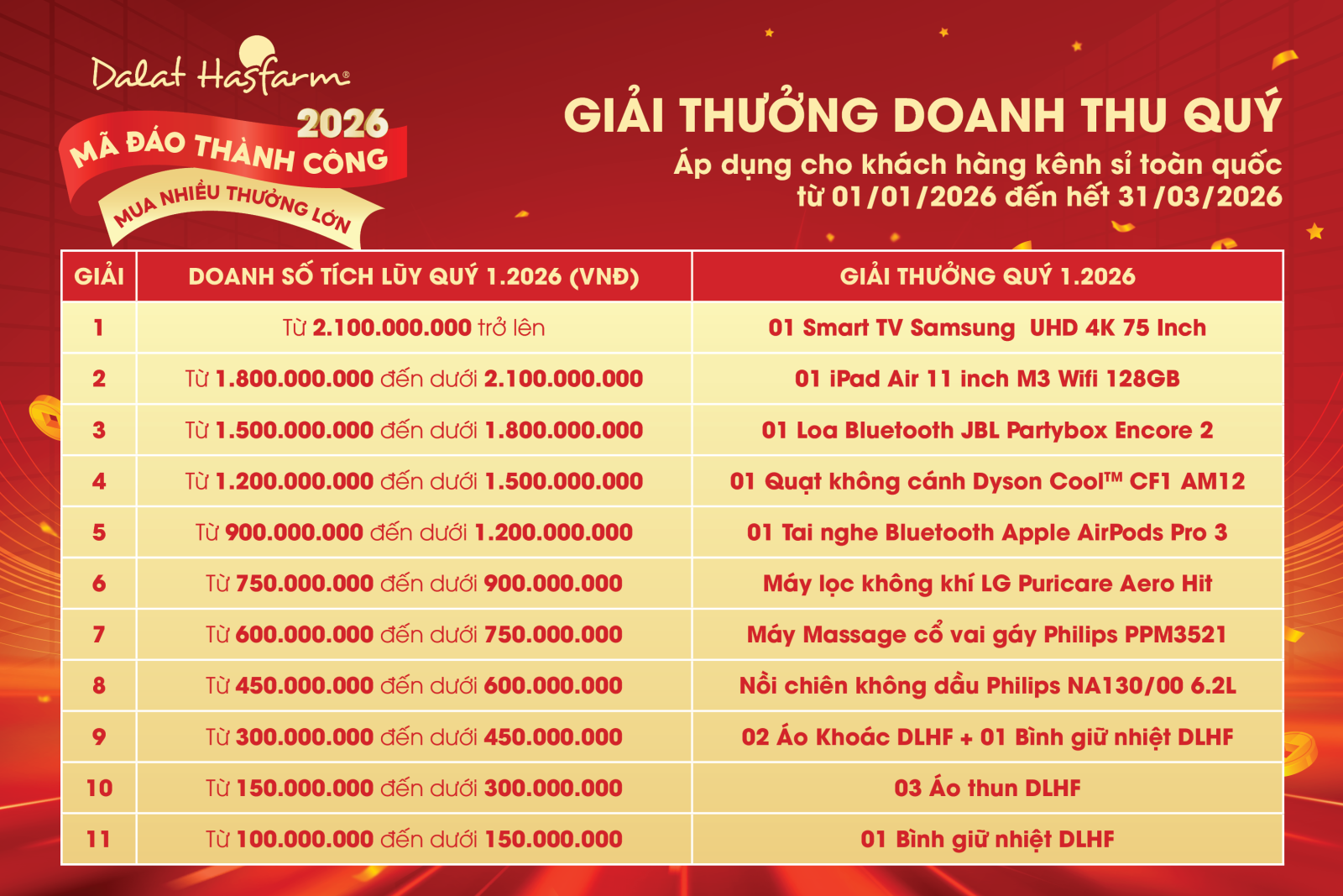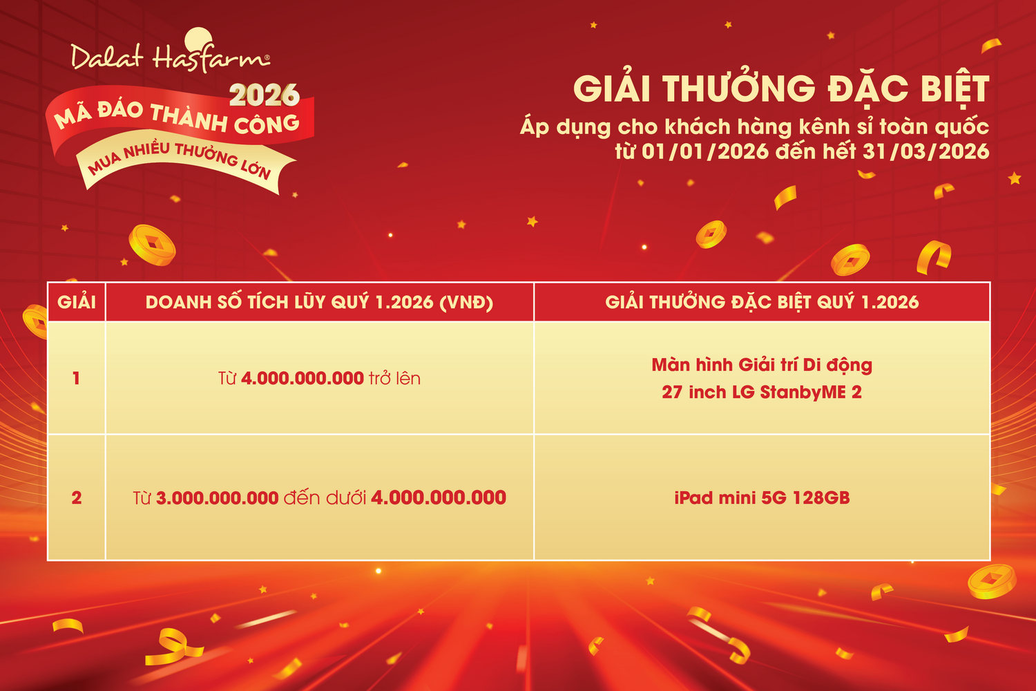 Khởi động năm 2026, Dalat Hasfarm mang đến Chính sách Thưởng Doanh Thu Quý 1/2026 như một cú hích mạnh mẽ cho hành trình kinh doanh đầu năm của Quý khách hàng kênh sỉ.