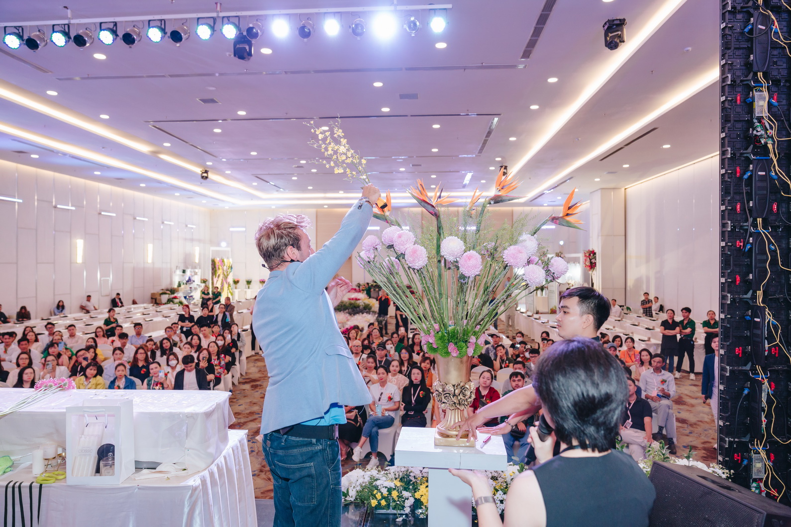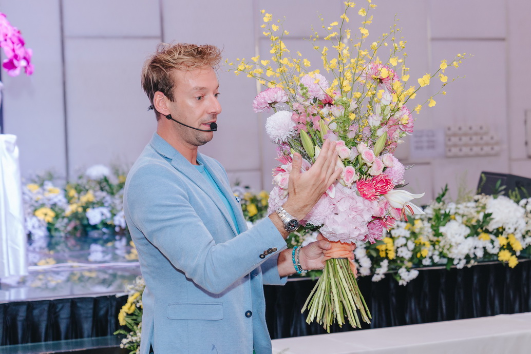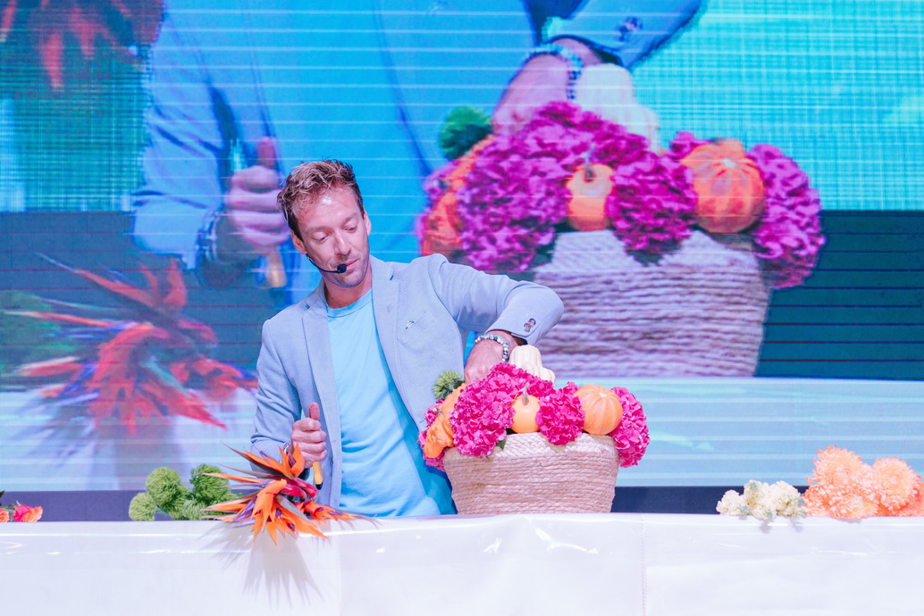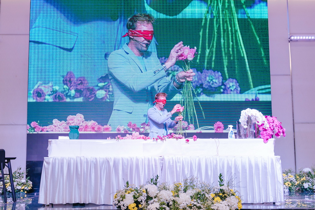 Khi buổi biểu diễn bắt đầu, dưới ánh đèn rực rỡ của sân khấu, Micheal Van Neman đã xuất hiện với vẻ ngoài lịch lãm và tự tin chia sẻ về quá trình sáng tạo và cảm hứng của mình, giúp khán giả hiểu rõ hơn về tầm quan trọng của nghệ thuật cắm hoa.