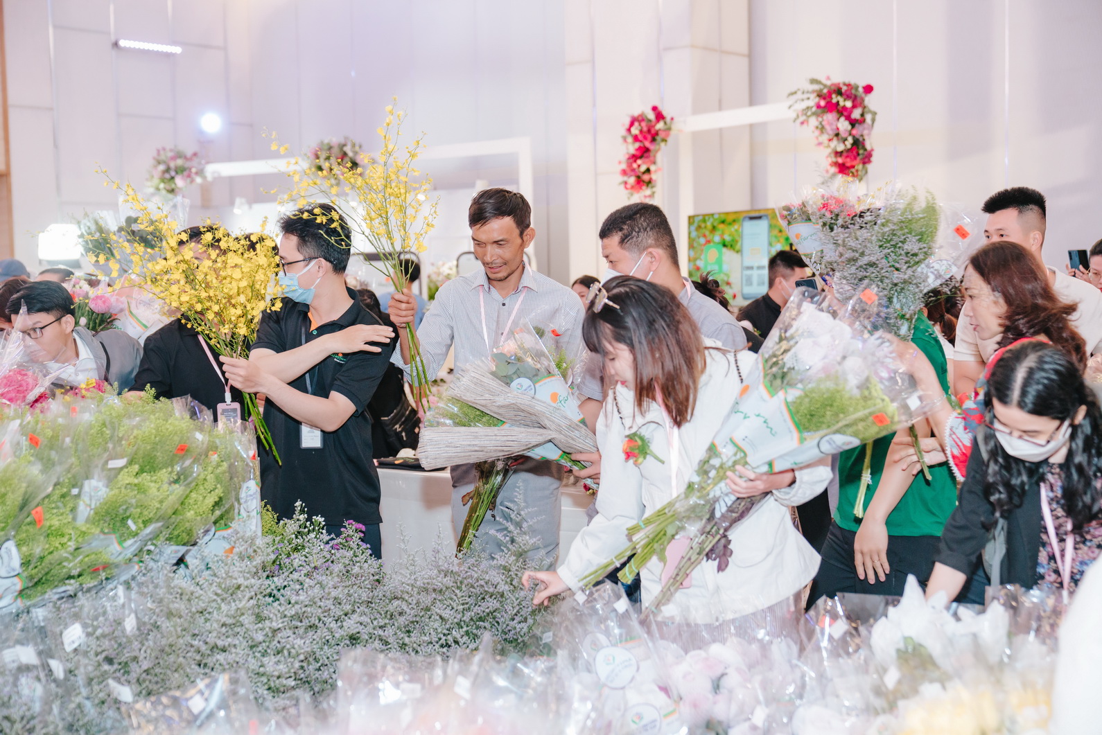 Không khí náo nhiệt và sôi động nhanh chóng lan tỏa khi mỗi florist tận hưởng quá trình sáng tạo của mình và chia sẻ cùng nhau những ý tưởng và kỹ thuật.